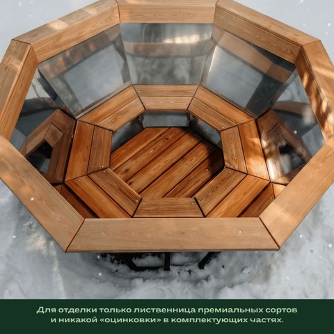Натуральная отделка из лиственницы добавляет ощущение тепла и природной гармонии, а современное окрашивание делает чан стильным элементом двора, террасы или банного комплекса.