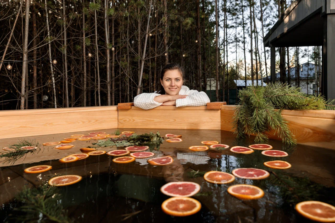 Большая, уютная купель, нагреваемая дровами, прямо под открытым небом!