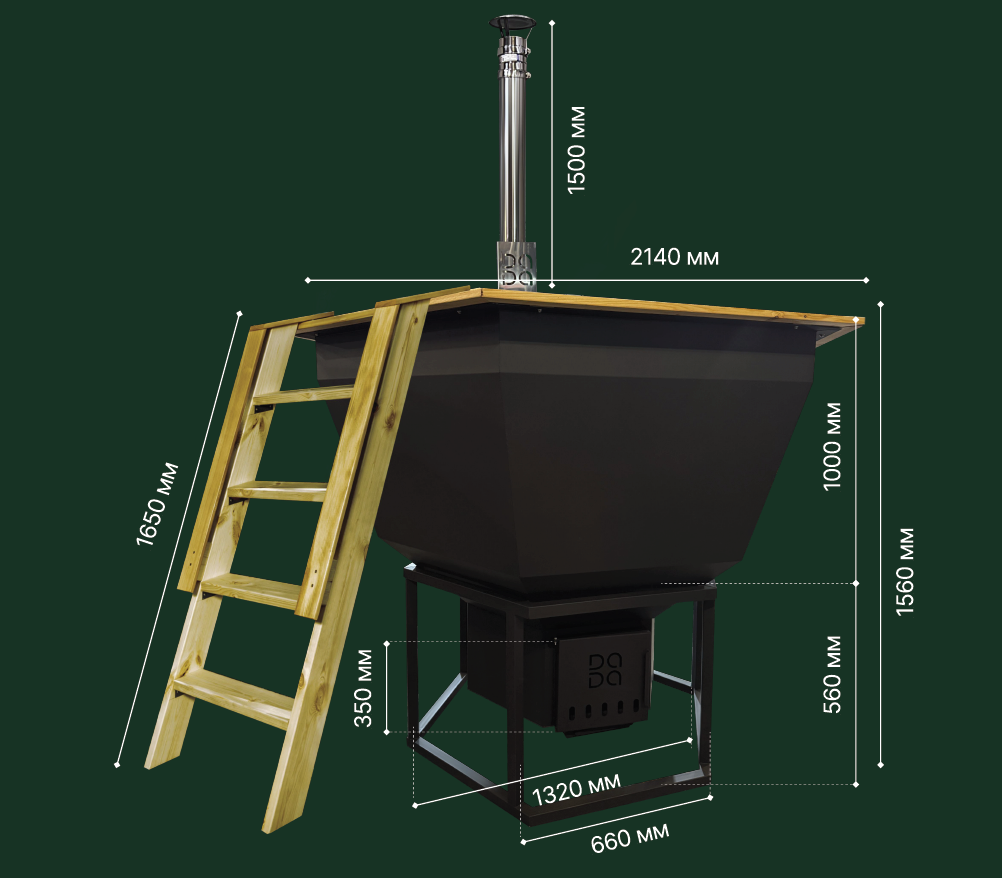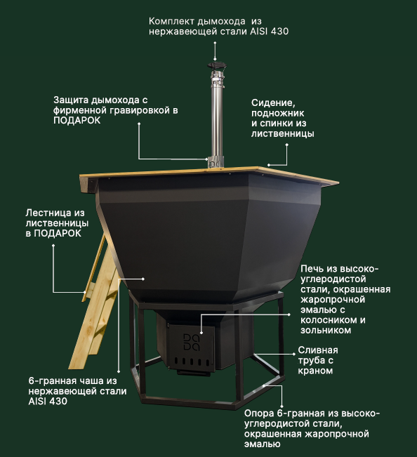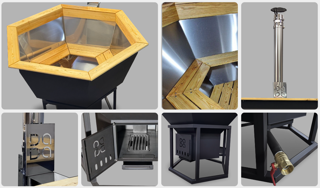 Для частей, контактирующих с водой и паром, в DADA-чaнe применяется нержавеющая сталь, а для прямого воздействия высоких температур используется жаропрочная высокоуглеродистая сталь. Это обеспечивает оптимальное соотношение эксплуатационных характеристик, безопасности и срока службы банного чана.