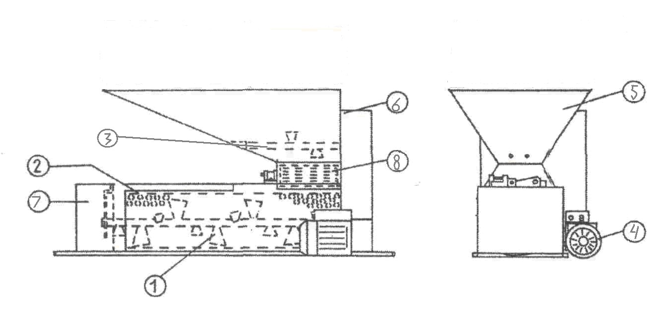 Виноград скользит по стенкам бункера (5) на пару роликов (8), где производится его дробление. После того, как он раздроблен, подается к гребнеотделительному валу (1), где отделяются стебли. Далее виноград поступает в корзину с отверстиями (2) и попадает в предварительно подставленную под машину емкость.