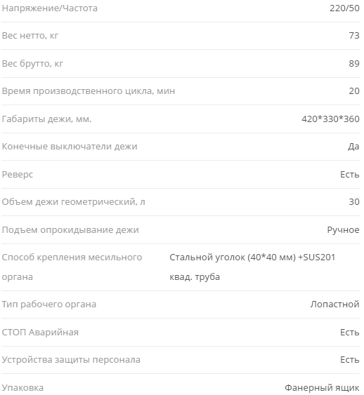 Фаршемешалка имеет удобную конструкцию: при опрокидывании месильной емкости (дежи) оператор повторно включает вращение рабочего органа, и выгрузка готового фарша происходит автоматически. Также изделие имеет быстросъемный рабочий орган, что позволяет использовать различные по форме и назначению месильные лопасти для разных продуктов, а также удобно производить санитарную обработку по окончании работы.