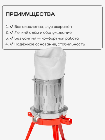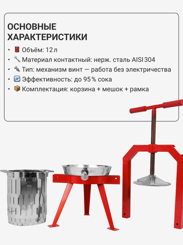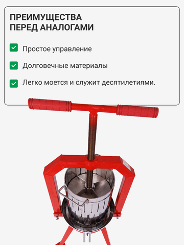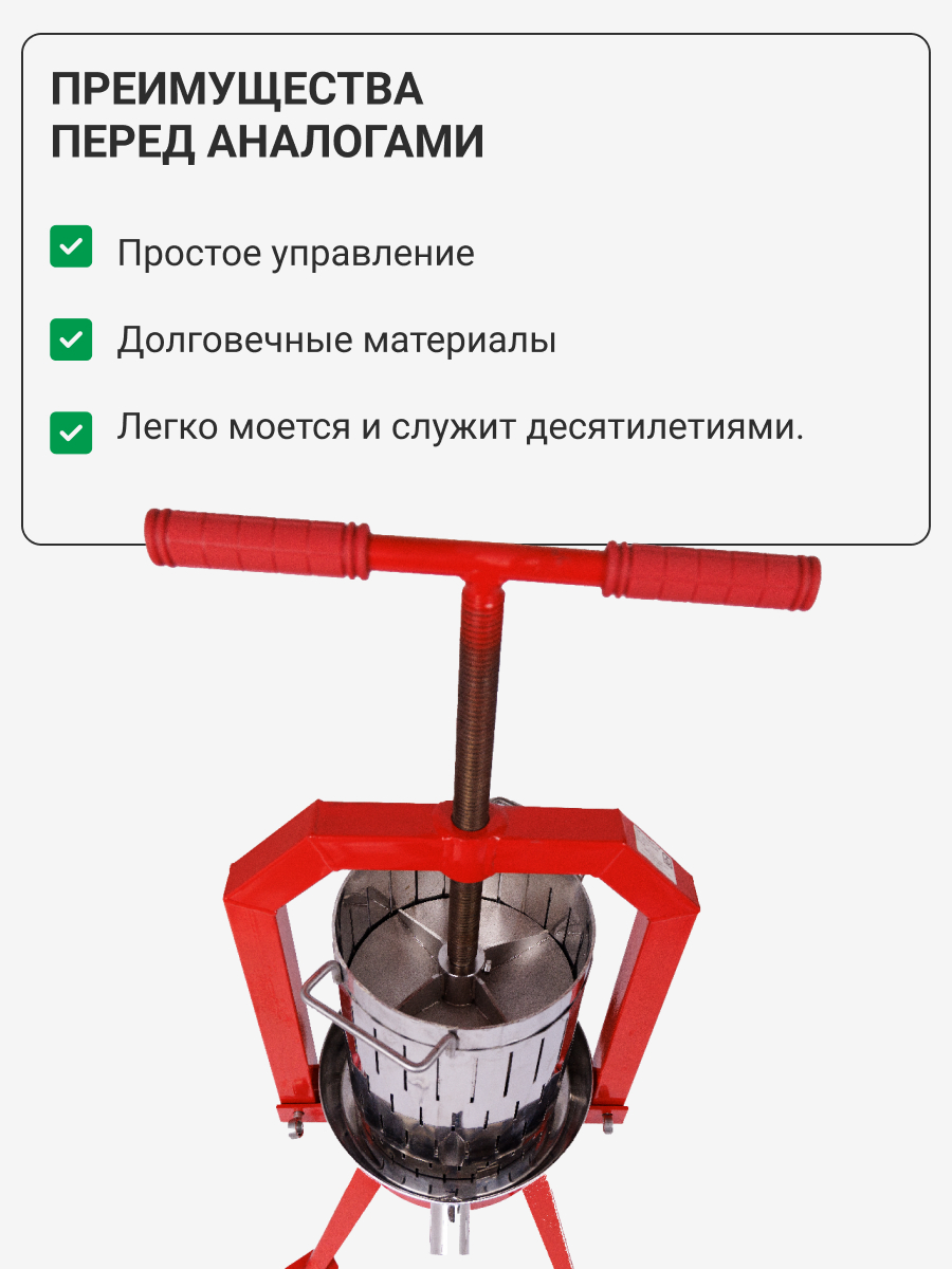 Неприхотливость материалов, из которых изготовлен пресc, позволяет хранить его без особых условий а так же он удобен в обслуживание. Невероятно нужное и полезное устройство для любого фермера и домашнего винодела. Среднее время отжима на данном прессе занимает от 10 до 15 минут, что позволяет сэкономить время и силы.