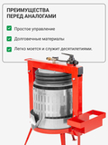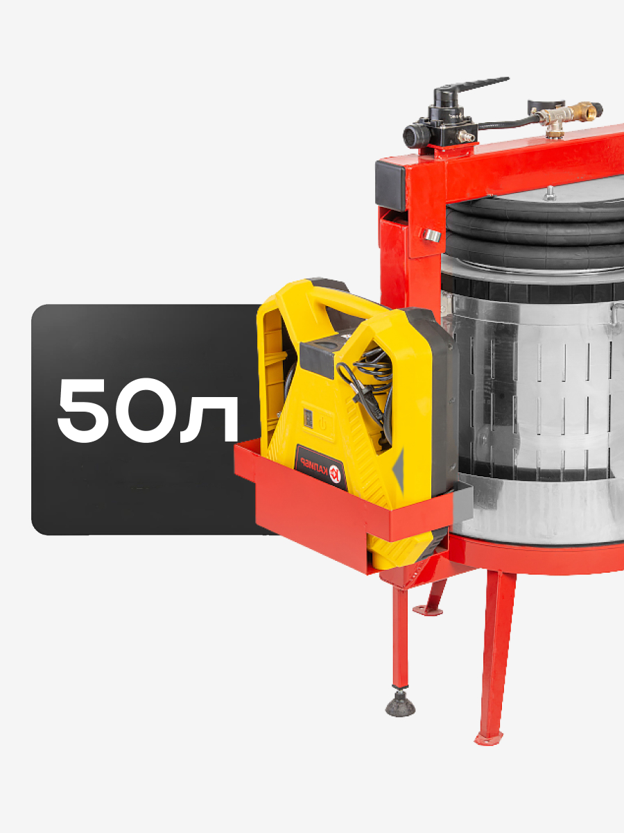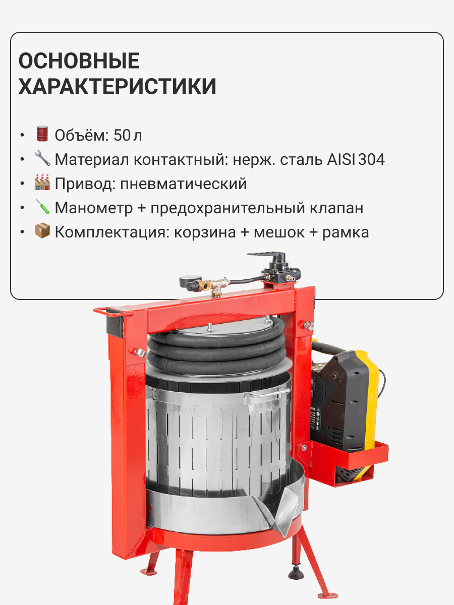 Пресс Муромец с пневмоприводом 50 литров из нержавеющей (антикоррозионной) стали для отжима сока из винограда, яблок, груши, свёклы. «Муромец» используется не только для отжима сока и сусла фруктов и овощей, но и получил широкое применение в сыроделии для прессование многих видов сыра, таких как: пармезан, чеддер, гауда, эдам, маасдам и т.д.